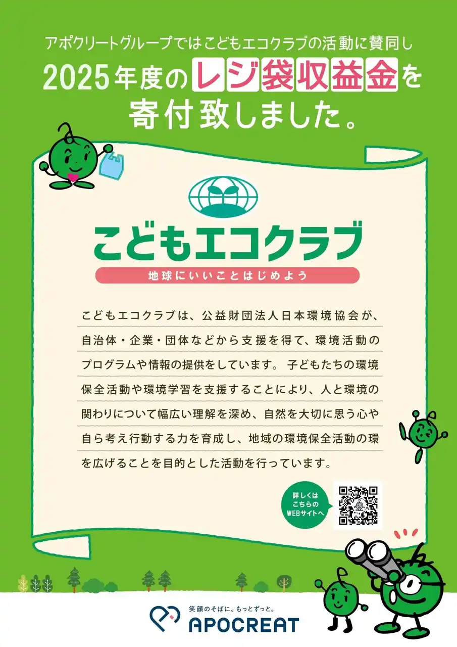 「アイランド薬局」、「薬局アポック」として薬局事業を中心に展開しているアポクリート株式会社(以下、アポクリート)様では、社会貢献活動としてレジ袋の有料化に伴い店舗で販売したレジ袋の収益金を寄付されています。2020年度より弊協会の全国の子どもたちを対象とした環境教育・普及啓発事業「こどもエコクラブ」に賛同くださり、継続的にご支援いただいています。 |