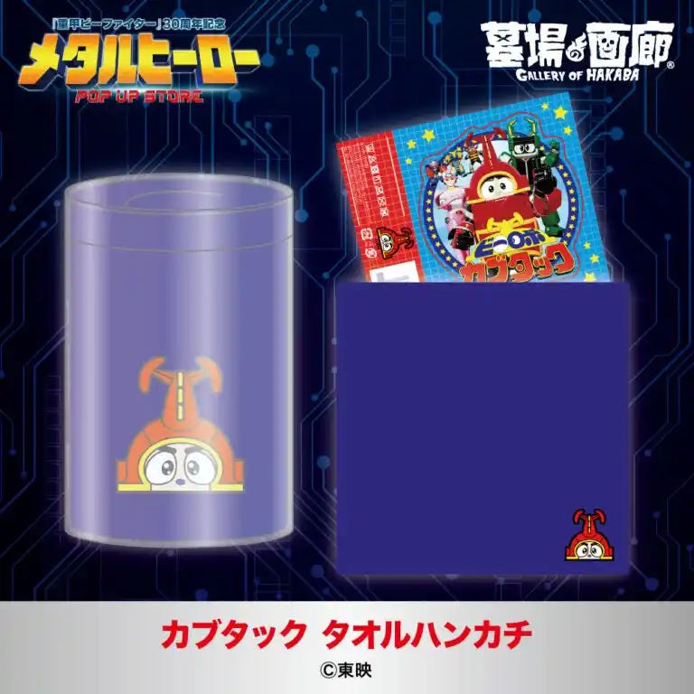 メタルヒーローシリーズの中でも可愛らしさの際立つ『ビーロボカブタック』の愛嬌ある表情が、ワンポイント刺繍で施されたタオルハンカチが登場!当時物を彷彿とさせるファンシーグッズ風のケース台紙はシールにもなっているお得な仕様!ファン必携の愛すべき1枚だ! |
