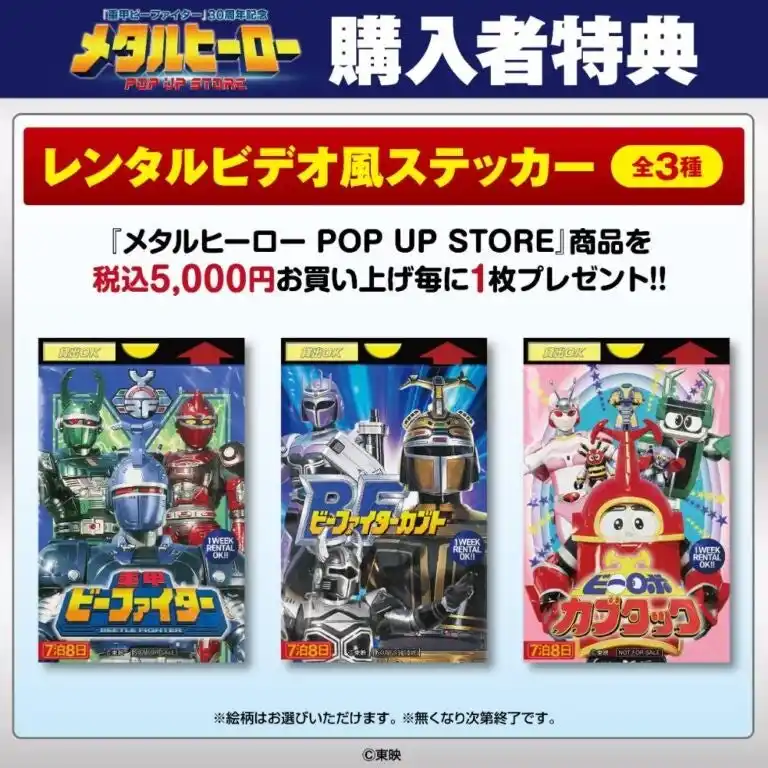 購入者特典「レンタルビデオ風ステッカー」をプレゼント! ※イベント開催期間中「メタルヒーローシリーズ関連商品(一部除く)」のご購入5,000円(税込)毎に1枚、「レンタルビデオ風ステッカー」をプレゼント。(無くなり次第終了) ※特典の交換はできませんのでご了承ください。 |