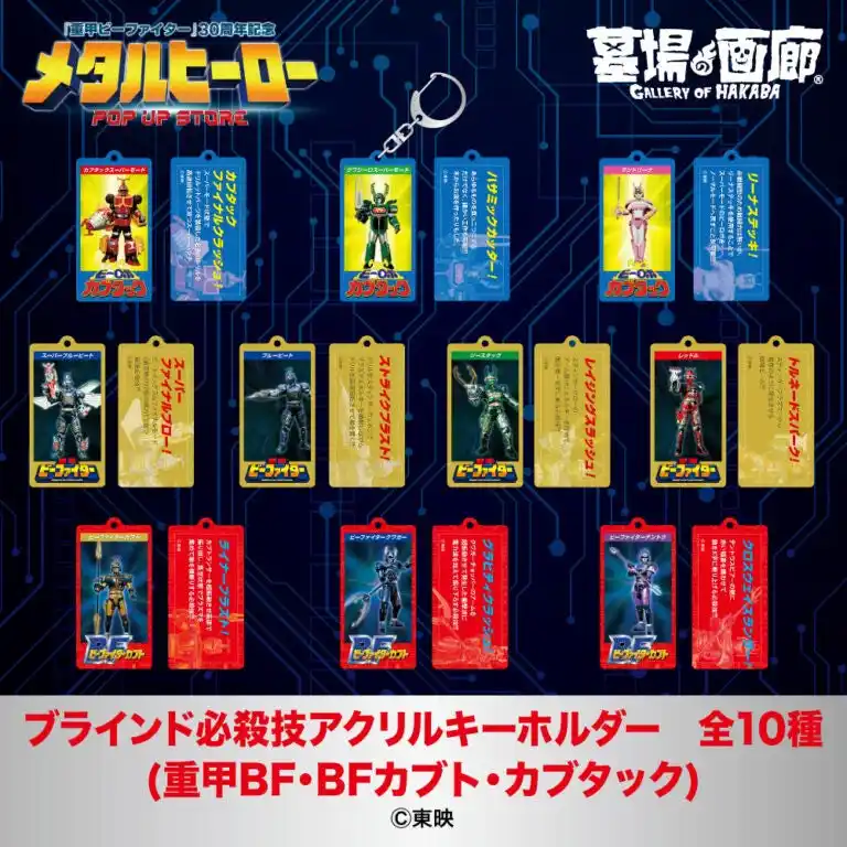 メタルヒーローシリーズでも異色を放つ『重甲ビーファイター』『ビーファイターカブト』『ビーロボカブタック』から、それぞれの必殺技を再現したアクリルキーホルダー10種が、ブラインド式で登場!好きな1枚を引き当てるか?それとも全種コンプリートを目指すか!? |