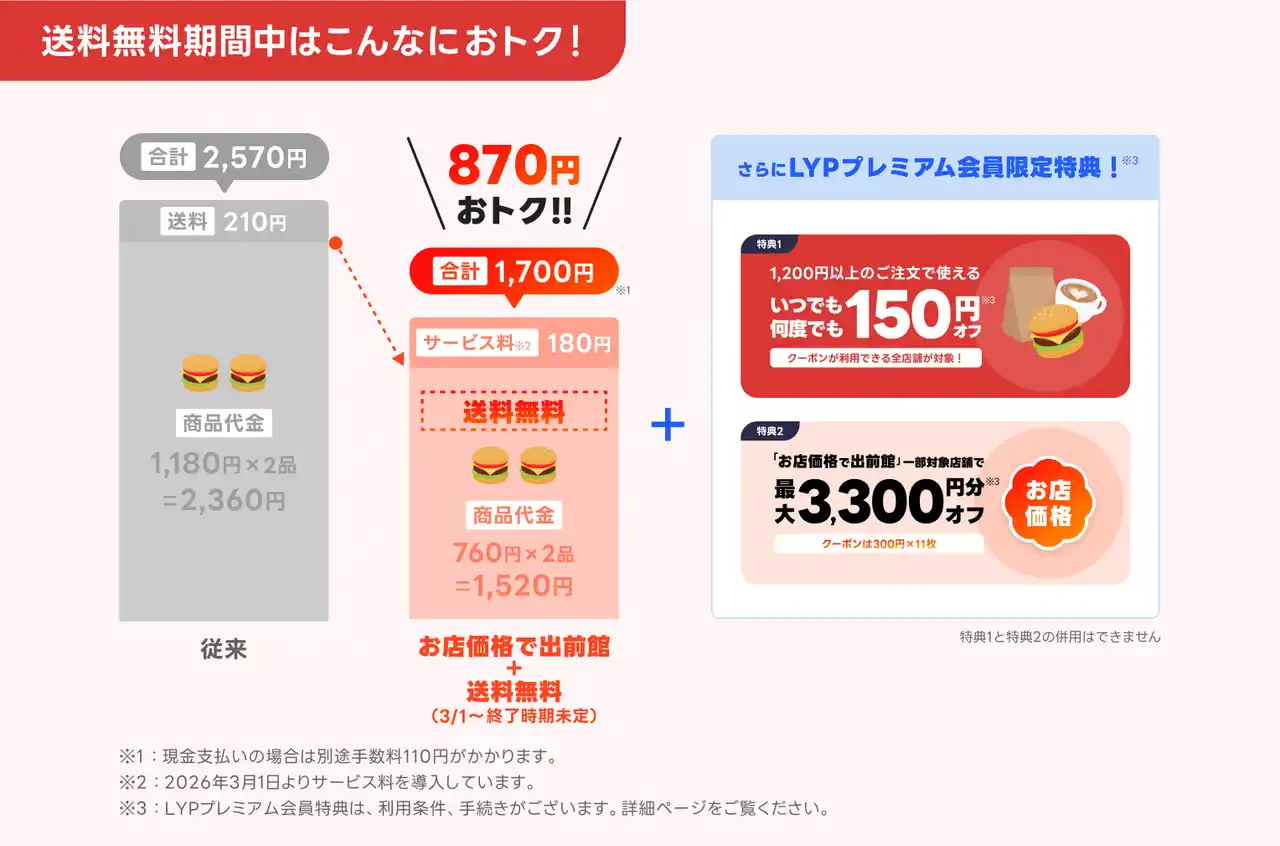 また、3月よりご好評いただいている送料無料(出前館がお届けする店舗に限る)と、LYPプレミアム会員限定の特典提供を継続、さらに抽選で豪華クーポンが当たるSNSキャンペーンも実施します。 |