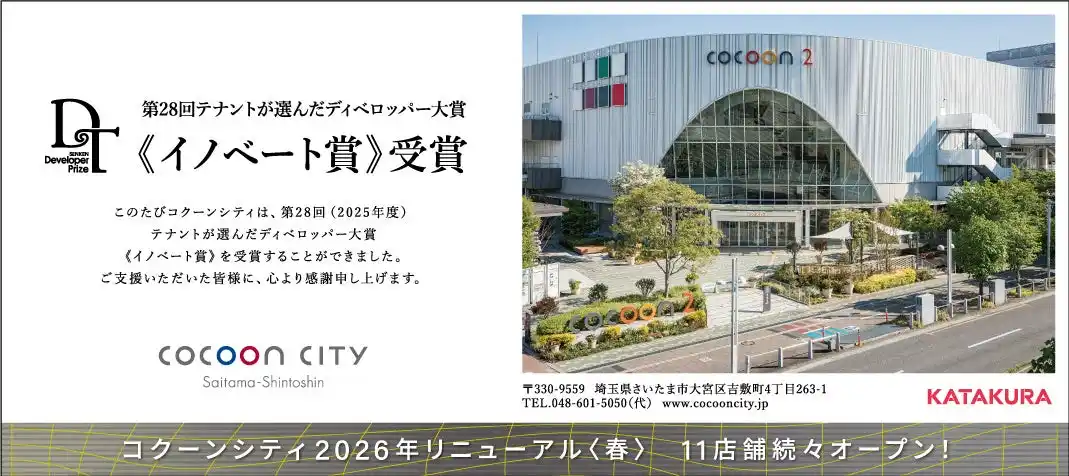 | カタクラが運営するJRさいたま新都心駅前社有地商業エリア「コクーンシティ」におきまして、繊研新聞社主催「第28回(2025年度)テナントが選んだディベロッパー大賞」の「イノベート賞」を受賞しましたので、お知らせします。 | |||