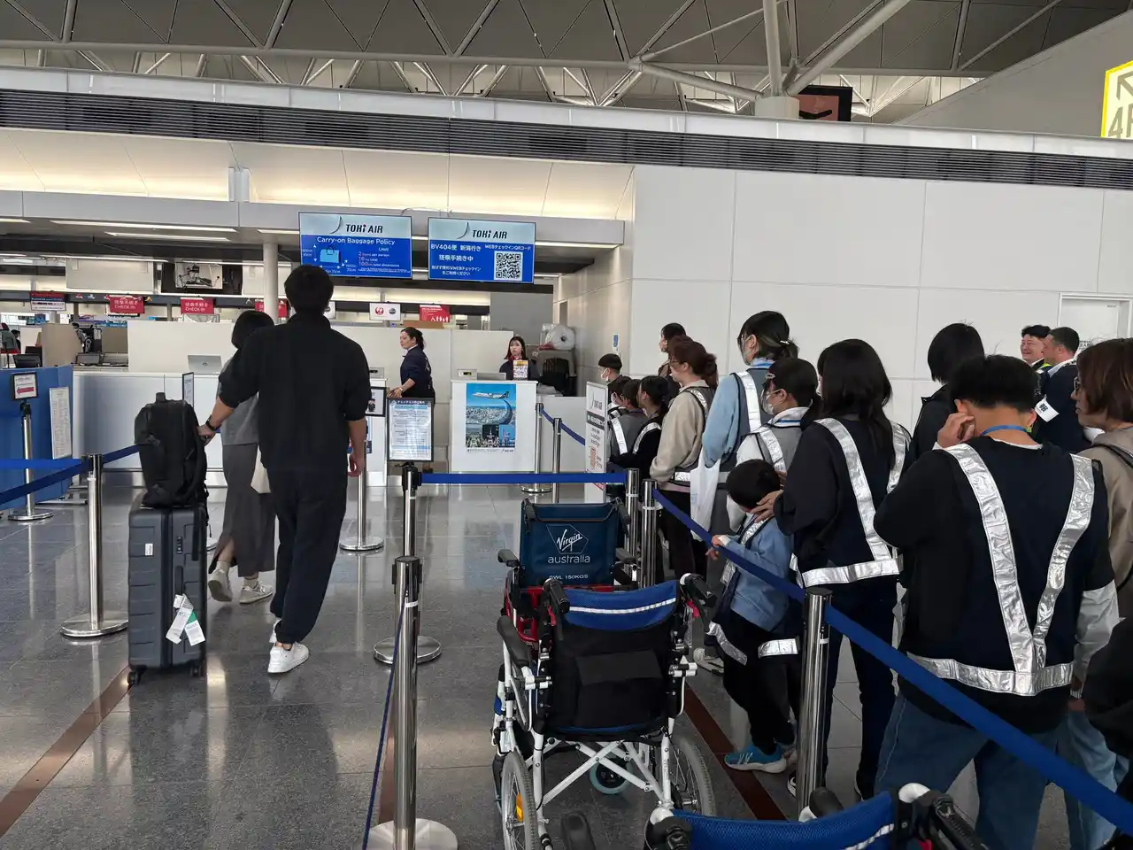 座学の後は、トキエアのカウンターを見学しました。チェックイン時間を迎えると、次々とお客様がカウンターを訪れ、受付が進んでいきます。てきぱきと対応するカウンタースタッフの動きや、座学で体験した荷物タグが実際に貼られ、預けられていく一連の流れを見ることで、航空会社の仕事をより身近に感じることができました。 |