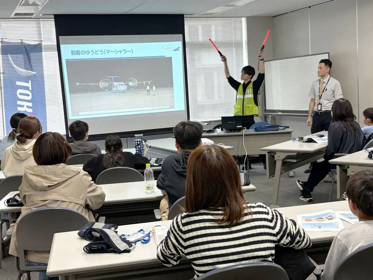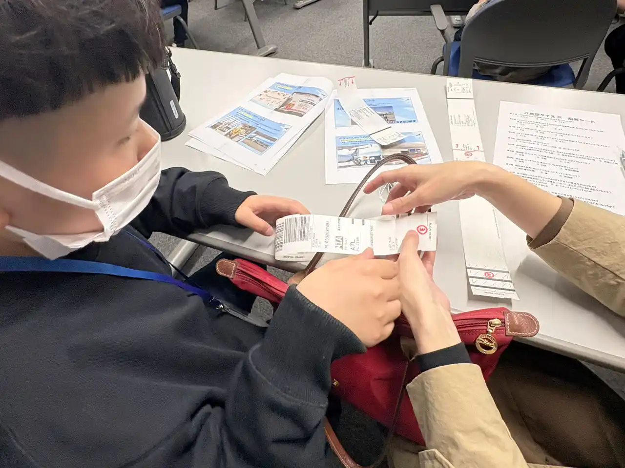 座学では、トキエアの職員から、飛行機の仕組みやグランドハンドリングをはじめとする空の仕事について説明を受けました。講義の途中には、実際の手荷物タグを自分の持ち物に取り付ける体験も行われ、親子で航空会社スタッフの仕事を身近に感じながら学びました。 |
