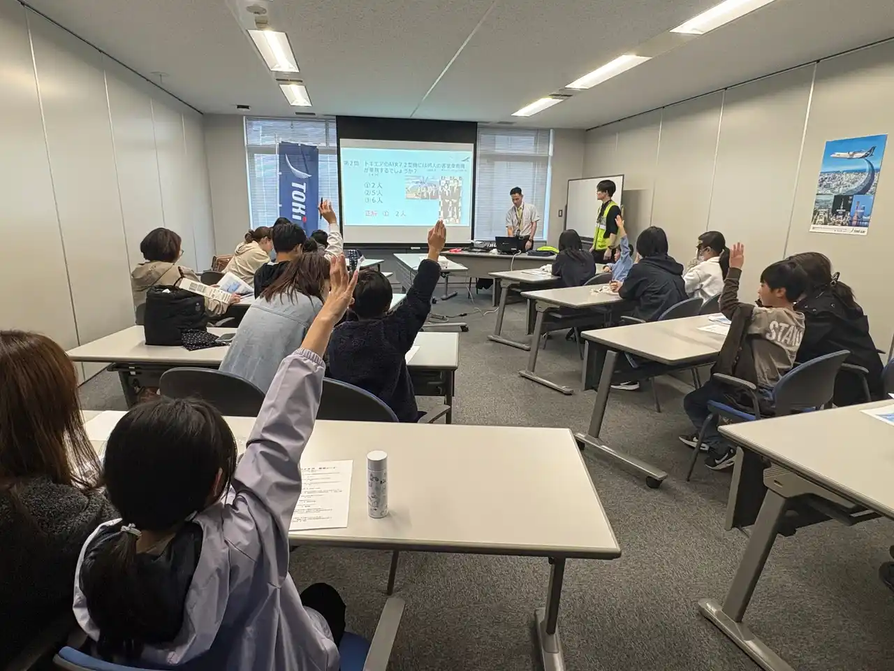 トキエア機のお見送りを終えた後、親子は部屋に戻り、学んだ内容を振り返るクイズ大会に挑戦しました。半日かけてじっくり学んだ成果もあり、次々と正解を重ね、会場は大いに盛り上がりました。こうして、楽しいおしごと見学会は満足の中で締めくくられました。 |