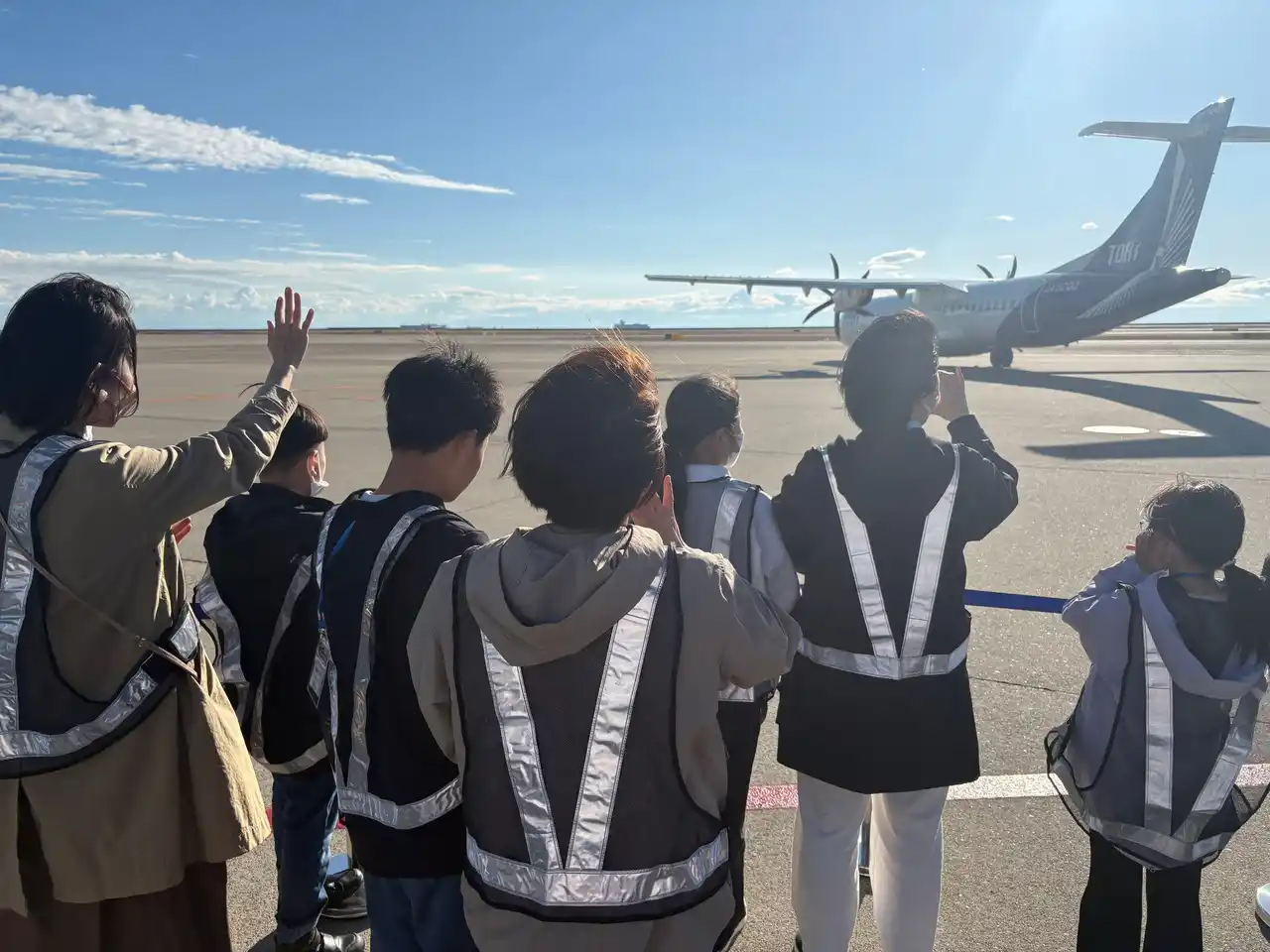 トキエアの飛行機についてじっくり学んだ楽しい時間はあっという間に過ぎ、飛行機は、新たなお客様を乗せて新潟空港へと旅立つ時間となりました。すっかりトキエアの機体と親しくなった親子は、名残惜しそうに、いつまでも手を振り続けていました。 |