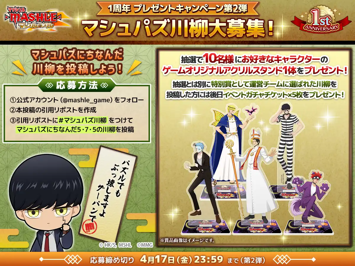 1周年を記念したプレゼントキャンペーン第2弾として、『マシュパズ川柳キャンペーン』を公式Xにて開催予定です!マシュパズにちなんだ川柳をXに投稿してキャンペーンに応募しよう!キャンペーンに応募で『マジックオアトリートオア』衣装のランス・ドット・レイン・ワース・セルの中からお好きなキャラクター1体のアクリルスタンドを抽選で10名様にプレゼントいたします。 |