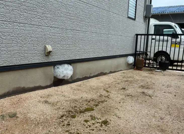 床下に泡が充満し、最も遠い換気口付近に泡があふれ出すことで、薬剤の到達を目視で確認できます。 |