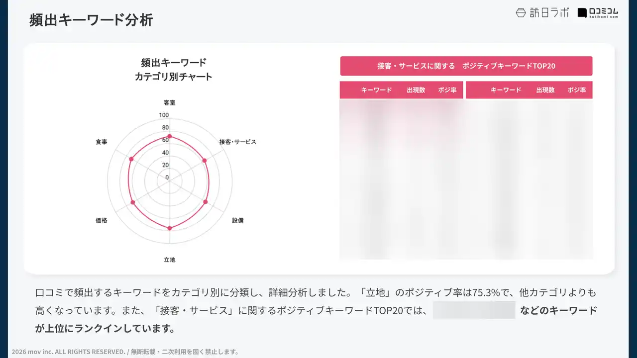 口コミに頻出するキーワードをカテゴリ別に分類し、詳しく分析しました。 |