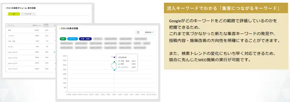 ユーザーが実際に検索したキーワードごとに、表示回数や検索順位を可視化。これまで気づかなかった新たな集客キーワードの発見や、MEO施策の優先度決定に直結します。 |