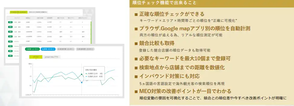 指定したキーワード×エリア×時間帯ごとの検索順位を自動で計測し可視化。ブラウザ・アプリ別の順位や、登録した競合店舗(最大3店舗)との順位比較、さらにはインバウンド対策に向けた多言語での順位計測にも対応しています。 |