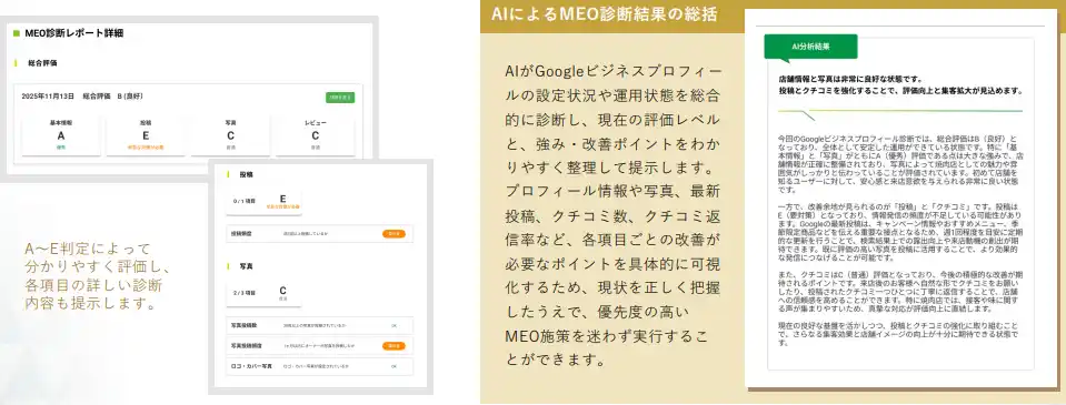 Googleビジネスプロフィールの設定状況をAIが総合的に診断します。現在の評価レベルや、プロフィール情報、写真、最新投稿などの項目ごとに改善ポイントをわかりやすく提示し、最適なMEO施策の実行をサポートします。 |