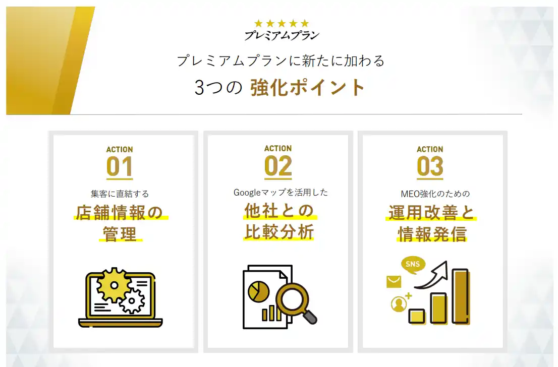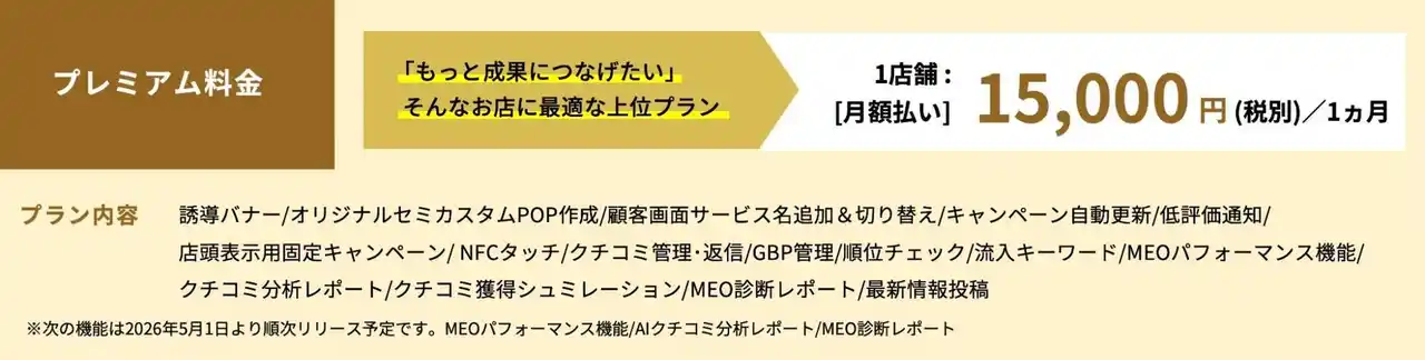 これまでのプレミアムプランでは「誘導バナー」や「オリジナルPOP作成」など、クチコミ獲得の最大化と運用の効率化に特化した機能をご提供してまいりました。 |