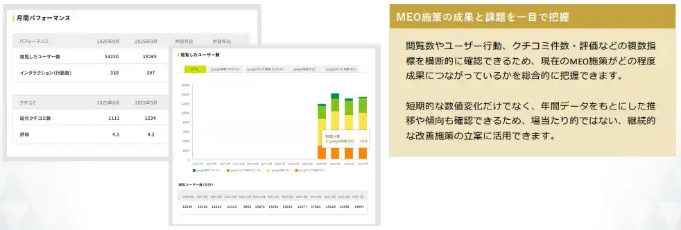 閲覧数やユーザーの行動(ウェブサイトへのアクセス、ルート検索、電話など)、クチコミ件数・評価などの指標を横断的に確認できます。年間データからの傾向分析も可能で、継続的な改善施策の立案をサポートします。 |