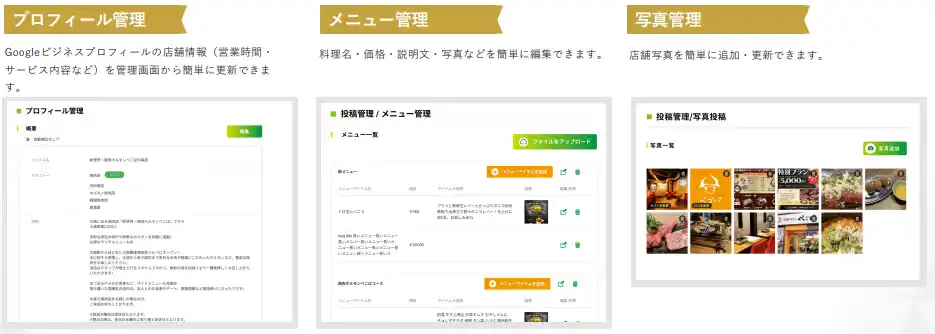 営業時間やサービス内容、料理名、価格、店舗写真などを管理画面から直感的に更新可能。常に最新情報を保つことで、Googleマップ上での表示品質を向上させます。 |