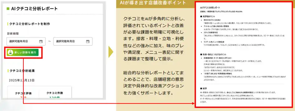 クチコミをAIが多角的に分析し、接客や料理といった強みだけでなく、改善が必要な課題まで明確に可視化します。客観的なデータに基づき、サービス改善や集客施策に直結するレポートを作成します。 |