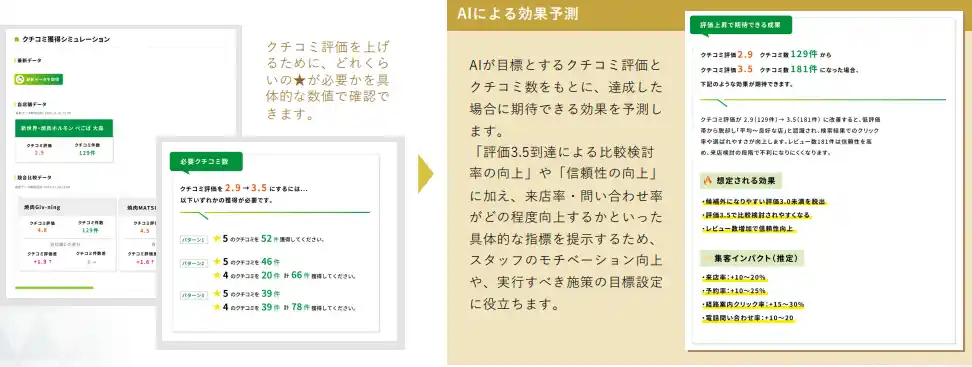 競合店舗とのクチコミ差を把握し、目標とする総合評価に到達するために必要なクチコミ件数をAIが算出。達成時の来店率や問い合わせ率の向上といった具体的な効果をシミュレーションし、店舗スタッフの目標設定やモチベーションアップに役立てることができます。 |