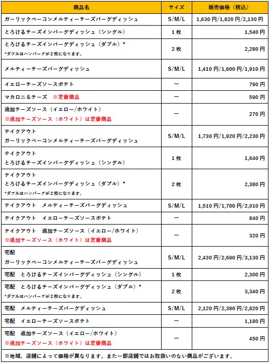 ディッシュメニューでは、ガーリック、ベーコン、3種のチーズのハーモニーが愉しめる「ガーリックベーコンメルティーチーズバーグディッシュ」。ハンバーグの中にシュレッドチーズを詰め込み、さらに上からチーズソースをかけた「とろけるチーズインバーグディッシュ」。いつものチーズバーグディッシュに濃厚なイエローチーズソースがかかった「メルティーチーズバーグディッシュ」3種を販売いたします。 |