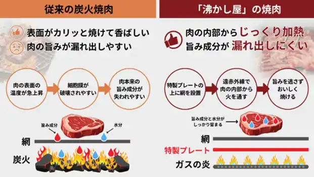 従来の炭火焼肉と「沸かし屋」の焼肉の比較画像です。 |