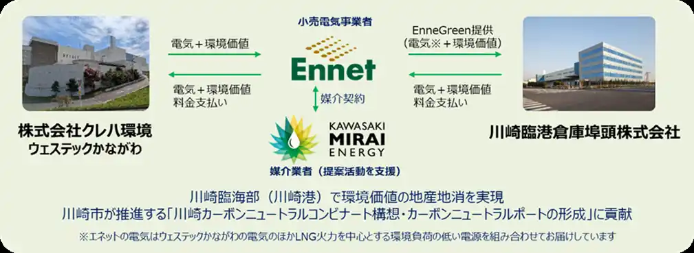 発電した電気のバイオマス由来分(再生可能エネルギーに相当)の川崎市内での活用を模索していたクレハ環境とその電気と環境価値を調達しているエネットが、地域のエネルギープラットフォームの役割をめざす川崎未来エナジーと連携し、カーボンニュートラルの取組に積極的な川崎臨港倉庫埠頭へ提案を行うことにより、川崎臨海部(川崎港)で実質再エネ電力の活用による地産地消を実現しました。 |