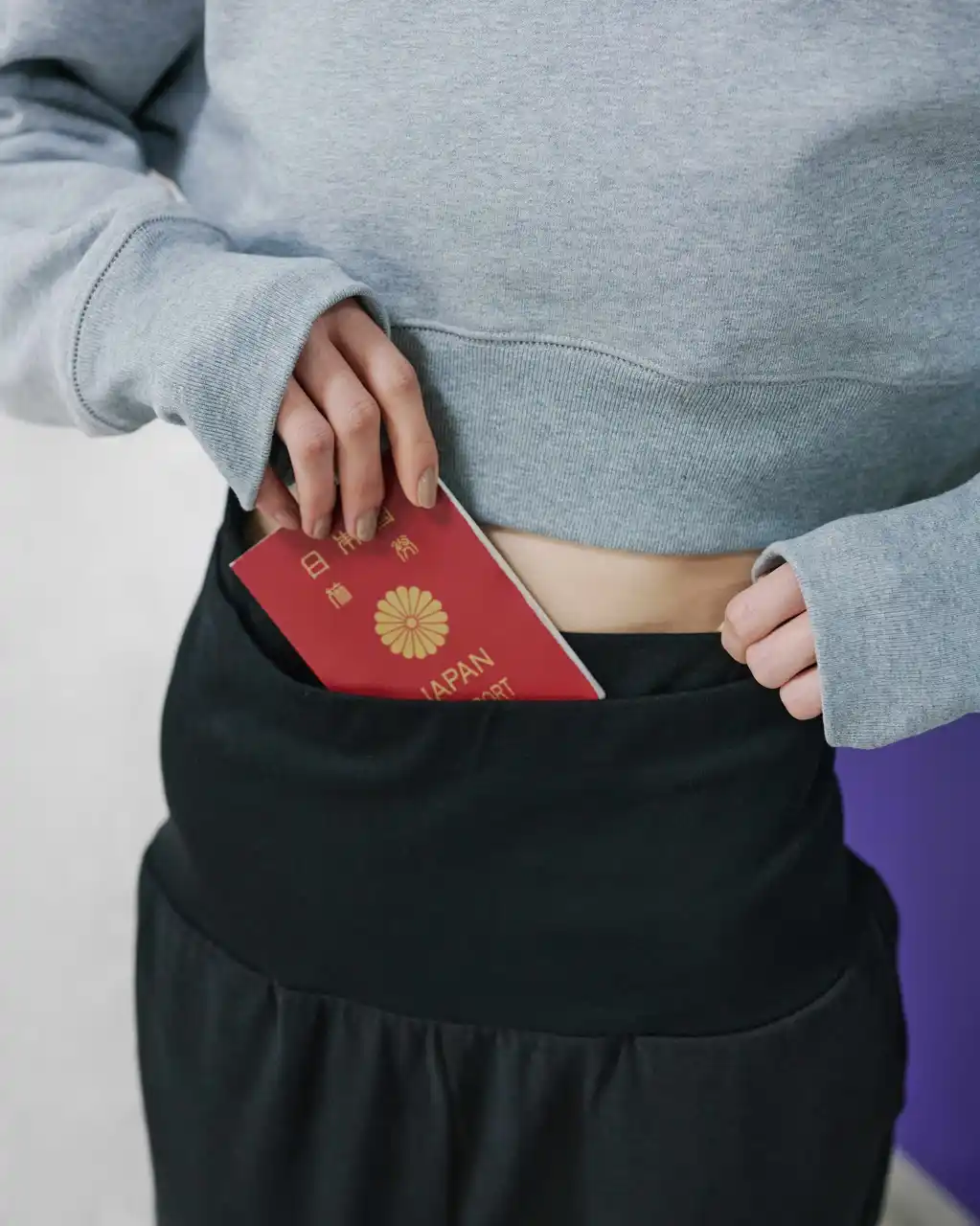 リブ素材の二重構造になったウエスト部分は、大容量ポケットとして機能。 パスポートやスマートフォンなどの貴重品をすっきり収納でき、移動時の動きをよりスムーズにします。 |