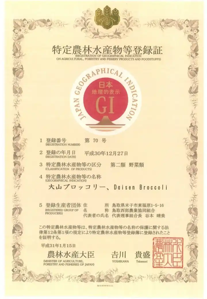 鳥取県西伯郡大山町及びその周辺の大山山麓(鳥取県西伯郡日吉津村・南部町・伯耆町、同県日野郡日南町・日野町・江府町、同県米子市)で生産されたブロッコリーが大山ブロッコリーとして、GI(地理的表示保護制度)登録されています。 |