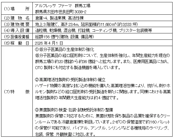 【アルフレッサ ホールディングス株式会社】 アルフレッサ ファーマ株式会社群馬工場における新たな医薬品製造棟稼働について