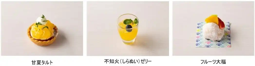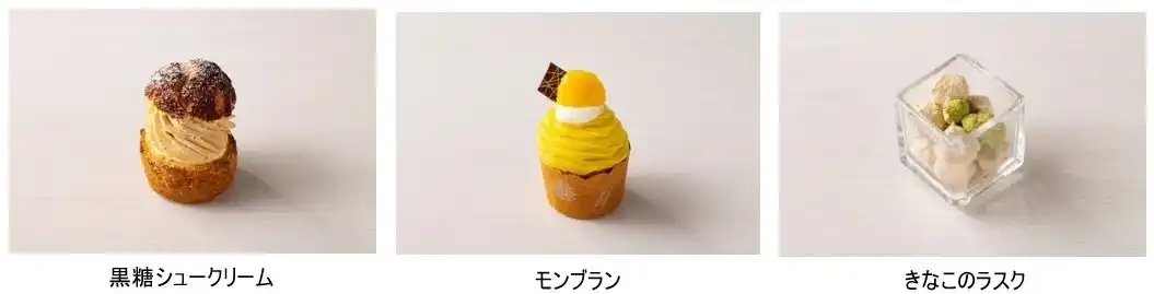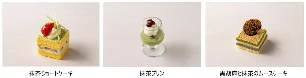 抹茶ショートケーキ、抹茶プリン、黒胡麻と抹茶のムースケーキ、甘夏タルト、不知火(しらぬい)ゼリー、フルーツ大福、黒糖シュークリーム、モンブラン、きなこのラスク |