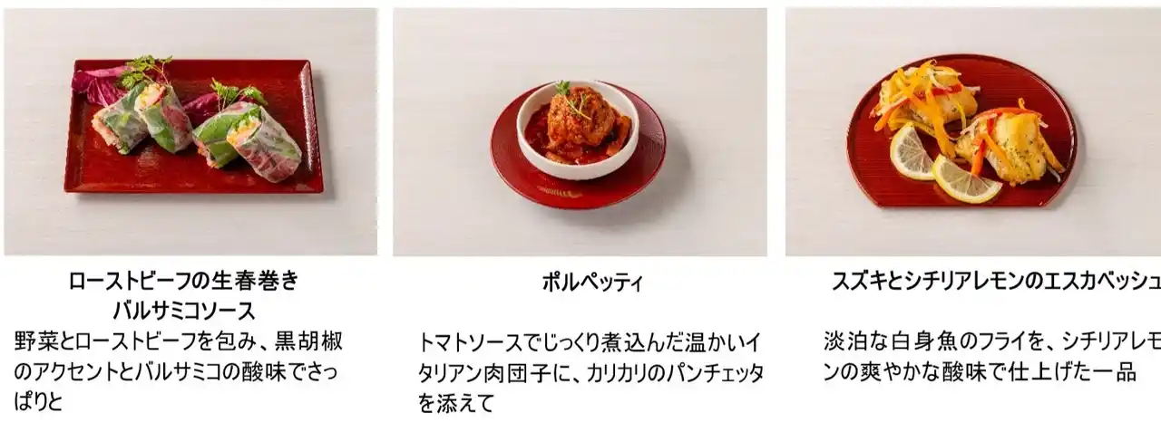 ローストビーフの生春巻き バルサミコソース、ポルぺッティ、スズキとシチリアレモンのエスカベッシュ |