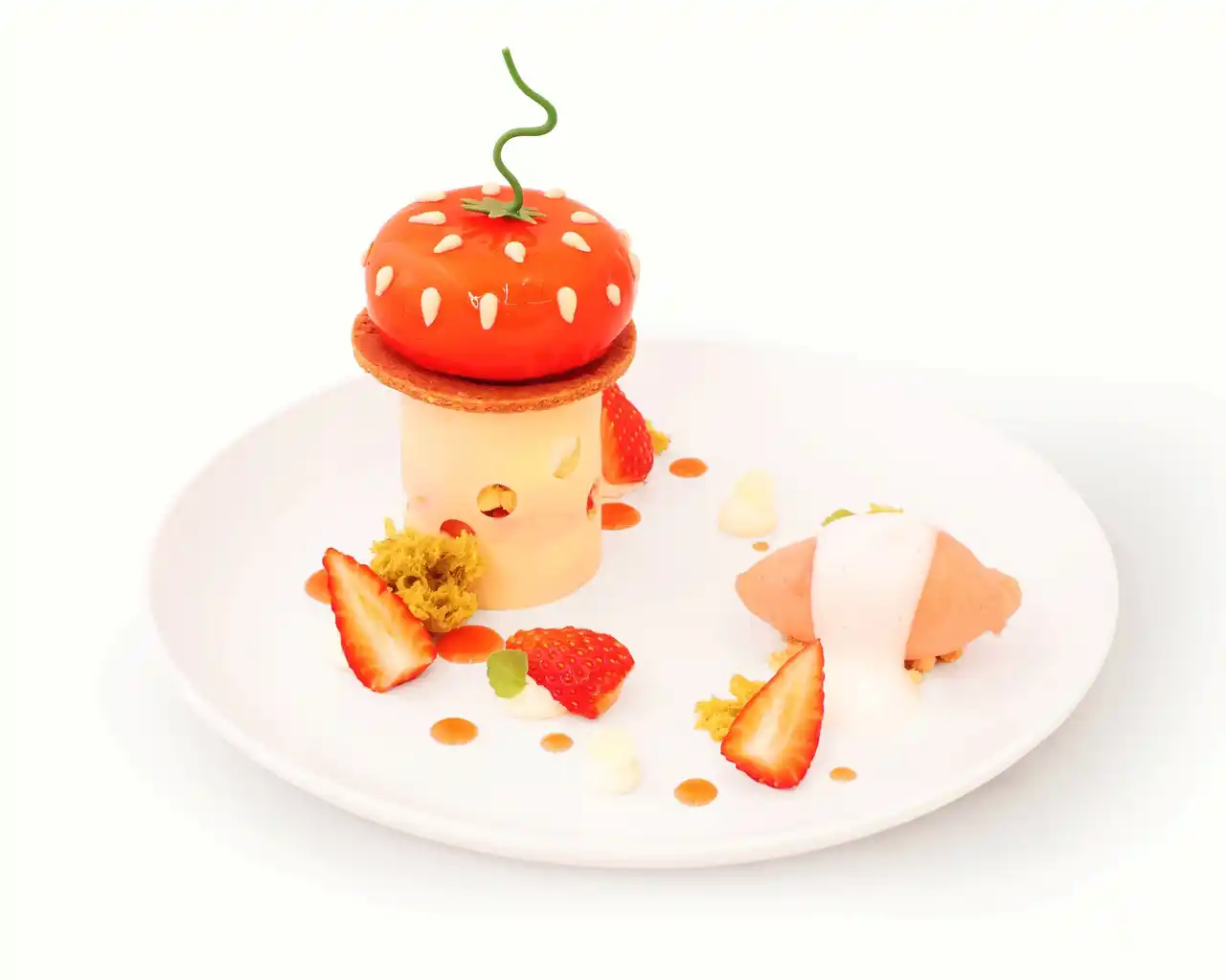 苺の魅力を、ひと皿の中でゆっくりとほどいていくデセール。 フレッシュの瑞々しさ、コンポートのやさしい甘み、ふんわりと軽いエスプーマ、ひんやりとしたシャーベット--異なる表情が重なり、口の中で繊細に移ろいます。 苺をかたどったホワイトチョコレートのムースのなめらかな口どけとともに、ショコラの奥行きあるコクが静かに広がり、春の余韻をやさしく引き立てます。 |