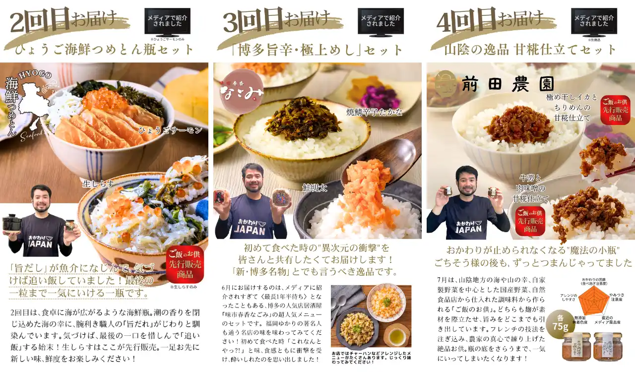 本サービスは毎月1回・全6回、おかわりJAPANが厳選したご飯のお供が届くサブスクです。毎回異なる産地・生産者の逸品が届くため、開けるたびに新しい発見と食の楽しみを感じられることでしょう。 |