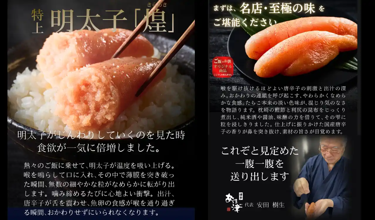 【The Otomo】の栄えある1回目を任されるのは、博多明太子の名店「あき津゛」がこのサブスクをきっかけに特別商品化した手仕込み天然だし明太子「煌(きらめき)」(160g)です。 |