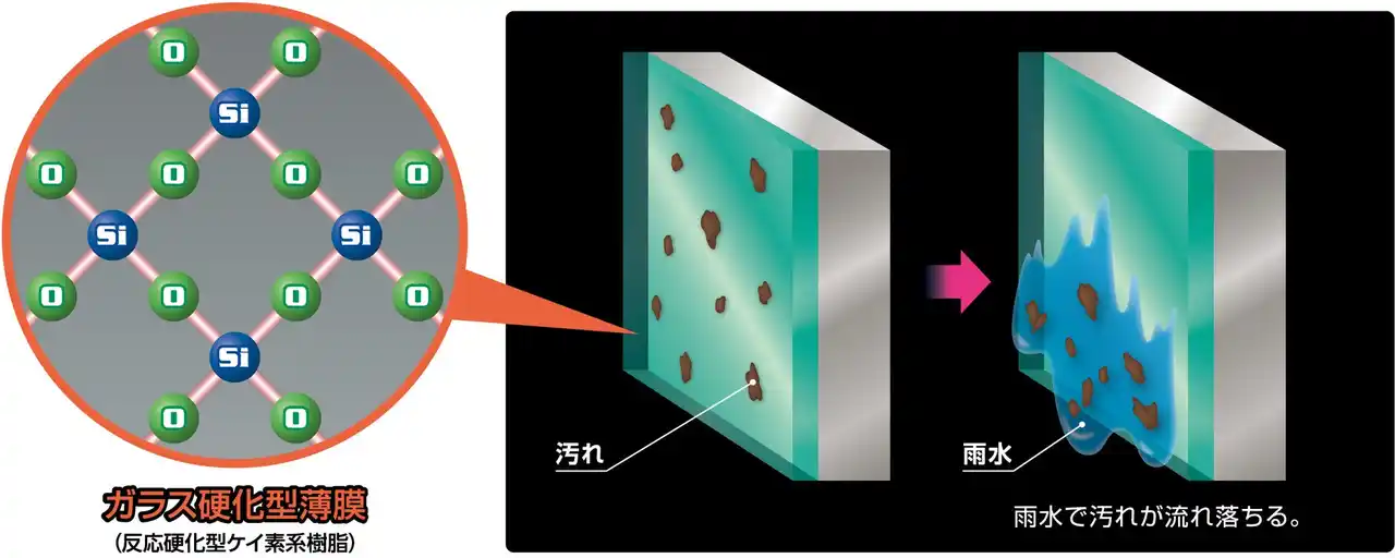 「自動車用反応型ガラス系コーティング技術」によって鉛筆硬度8H相当の高硬度なガラス系の被膜を形成し、紫外線や酸性雨などから強カにガードし、長期にわたって車体を保護します。 |