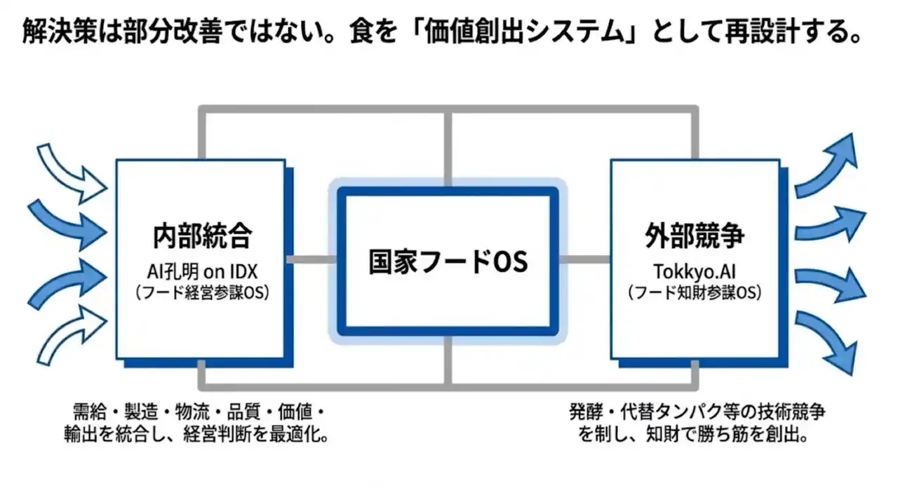 本サービスは、農業・食品製造・物流・外食・代替食品・栄養・輸出にまたがる経営課題を、 AI孔明 on IDX(フード経営参謀OS) と Tokkyo.AI(フード知財参謀OS) の二重構造で解決する、業界特化型AIプラットフォームです。 |