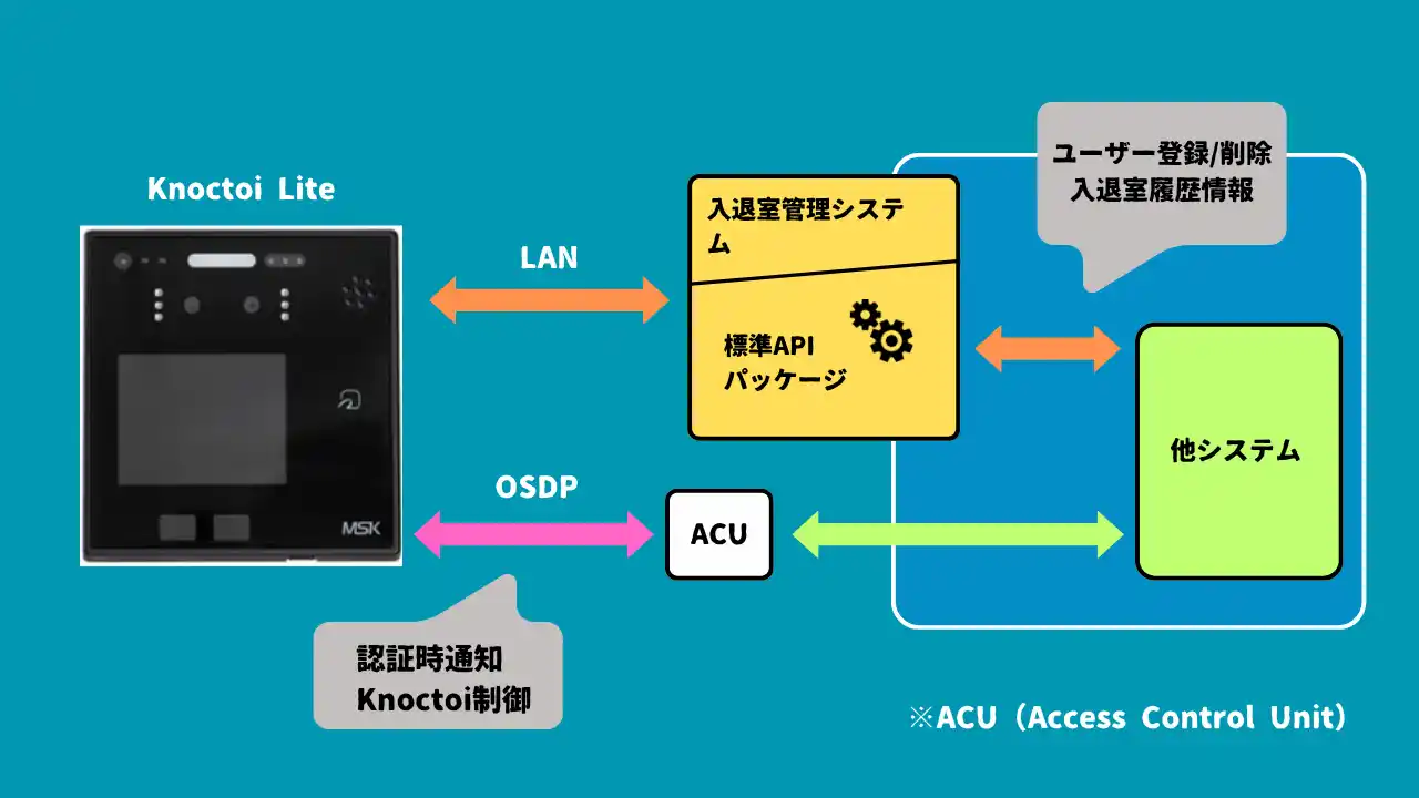 これにより、リアルタイムに認証IDを共有することやコントロール機器(ACU)等からKnoctoi Liteを直接制御することが可能となり、標準APIパッケージと併せてご利用頂くことで、さらに使い勝手の良いトータルシステムの構築が可能となります。 |