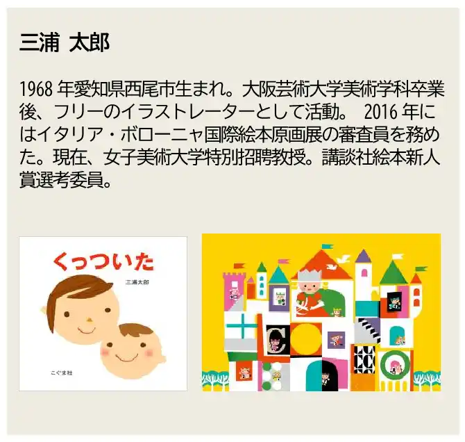 イラストは、イタリア・ボローニャ国際絵本原画展で入選を重ね海外でも絵本を出版し、なかでも「くっついた」は100万部を超えるミリオンセラーとなり、幅広い支持を集めている三浦 太郎氏によるものです。 |