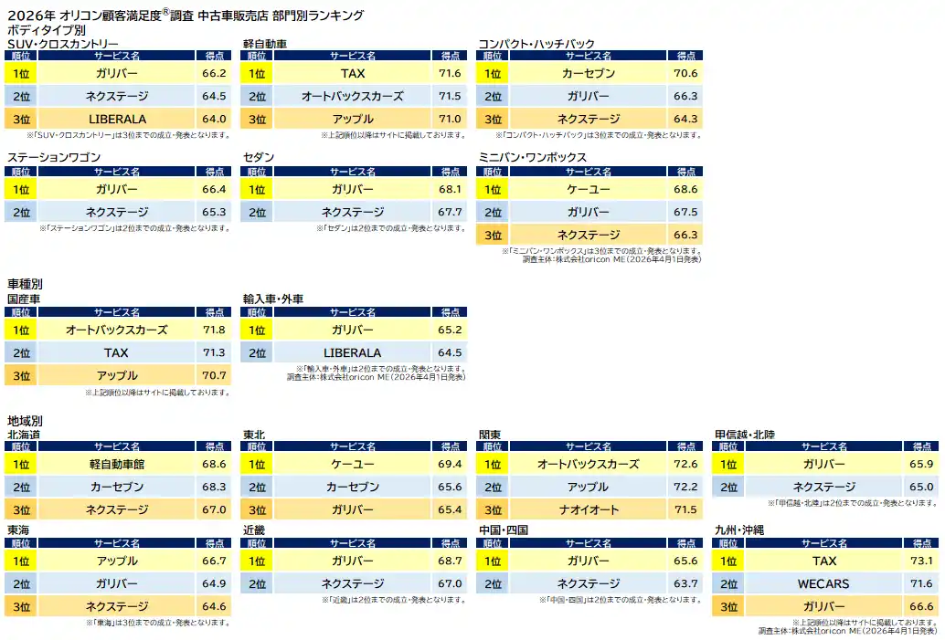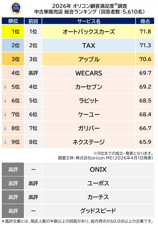 | オリコン株式会社(本社:東京都港区 代表取締役社長:小池 恒、略称:オリコン)は、グループ会社である株式会社oricon MEが、実際のサービス利用者を対象に第三者の立場で実施した『中古車販売店』の顧客満足度調査の結果を、2026年4月1日(水)14時に「オリコン顧客満足度(R)」公式サイト内にて発表いたしました。ランキングの結果は下記の通りとなりました。 | ||||||||||||