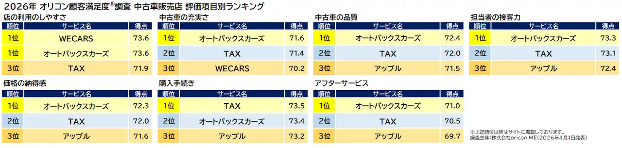 | 2026年 オリコン顧客満足度(R)調査 中古車販売店 | ||||||||||||