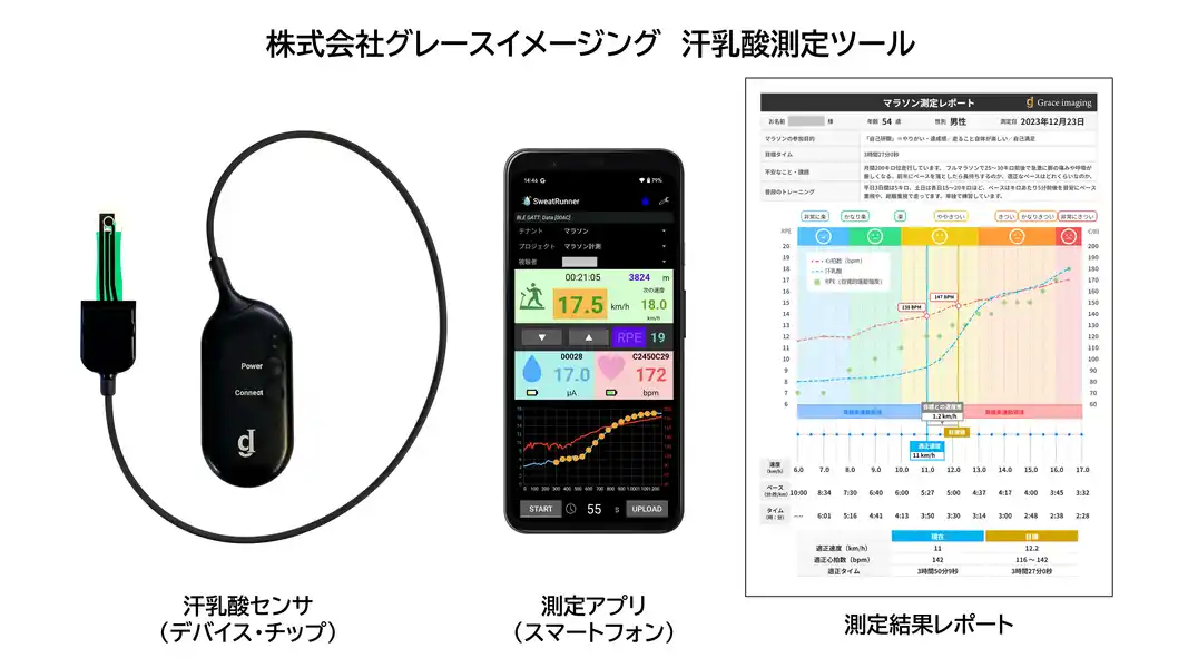 本製品は、皮膚に貼り付けるだけで、乳酸をその場で連続的に測定できる革新的なデバイスです。これまでの測定方法(採血など)に代わる新たな手段として、運動中の汗に含まれる乳酸を検出するチップを開発。化学反応で生じる電流信号を、無線通信によリスマートフォンのアプリで表示。乳酸値の変化を可視化します。 |