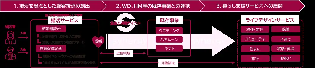 成婚を新たなスタートと捉え、将来的には住宅や保険などにもサポート領域を広げ、結婚後のライフイベントをトータルで支援していくことで、お客様の人生設計を生涯にわたってサポートする体制を構築します。さらに、「旅」を起点とした婚活イベントの企画・実施を通じて、地域の魅力発信や交流人口の創出を図り、地域活性化にも貢献してまいります。 |
