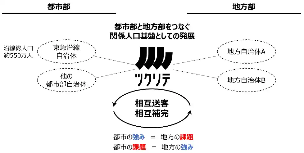 する仕組みを構築することで、都市部と地方部をつなぐ「関係人口」の創出を目指します。総務省が「ふるさと住民登録制度」の推進を図る中、当社は「ツクリテ」を通じて、「都市の強み」で「地方の課題」を解決し、「地方の強み」で「都市の課題」を補完する、双方向の送客や機能補完を実現します。都市・地方双方が「お互いさま」の関係で支え合える社会の構築に寄与していきます。 |