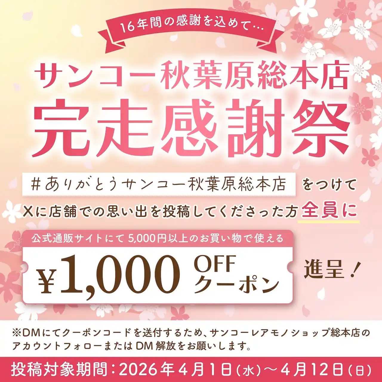 | 参加方法: 指定のハッシュタグ「#ありがとうサンコー秋葉原総本店」をつけて、店舗との思い出をSNS(X)に投稿。 | |||||||||||