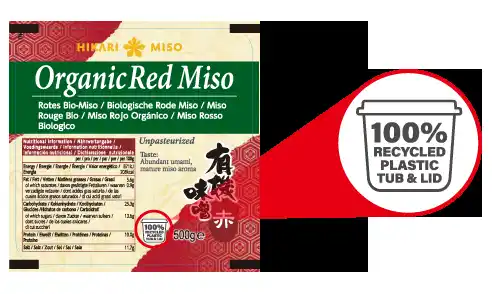 | ひかり味噌株式会社※1(長野県諏訪郡下諏訪町、代表取締役社長 林 善博、以下 当社)は、海外輸出用のオーガニック味噌『Organic Miso White 500g』と『Organic Miso Red 500g』の2品について、容器のカップと蓋に100%再生PET樹脂を採用いたします。対象商品には米国向けと欧州向けがあり、米国向け商品は4月より、欧州向け商品は5月より順次出荷を予定しています。これにより、年間で新たに使用されるプラスチック量を約18トン削減できる見込みです(前期出荷実績に基づく当社試算)。飲料業界では100%再生PET樹脂を使用した容器の活用が広がっていますが、味噌容器への採用は業界初(当社調べ)となります。 | |||||||||