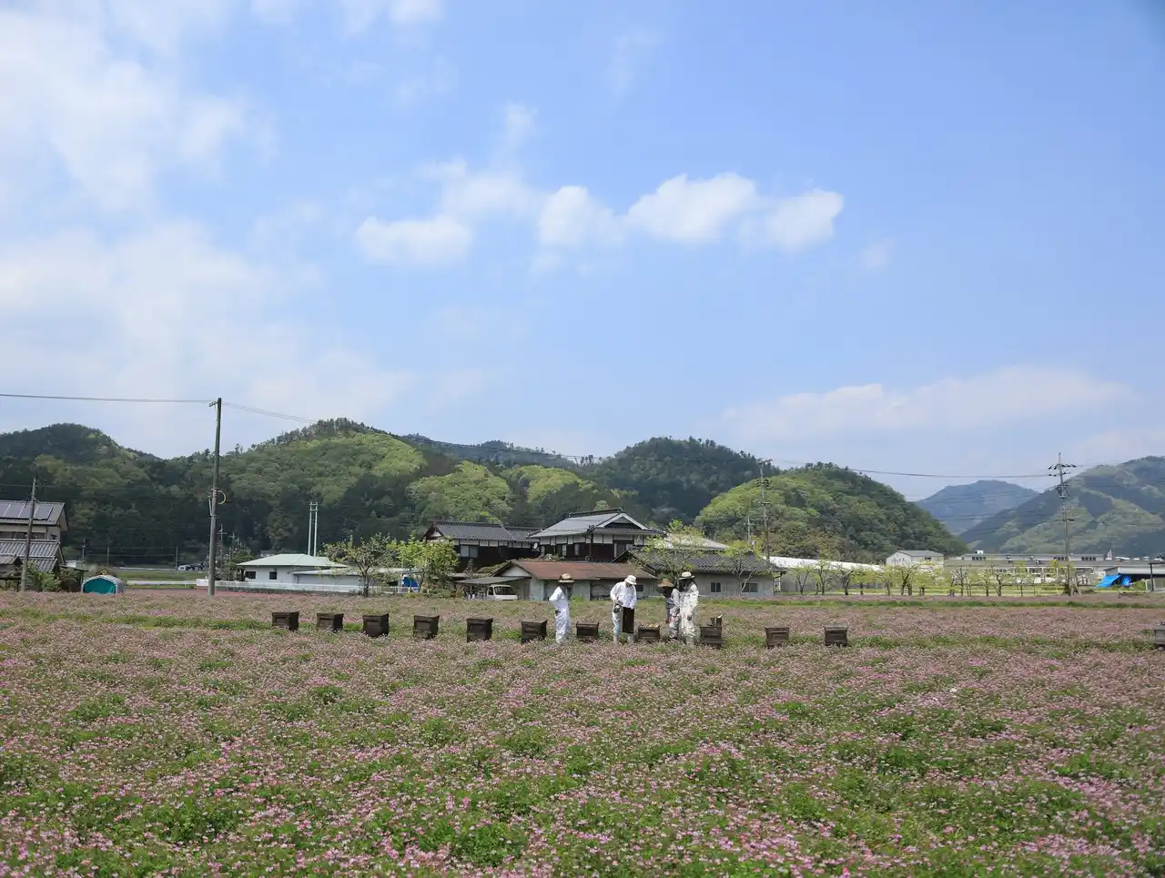 本社隣接の田んぼでは春に一面にレンゲの花が咲き、ミツバチはこのレンゲの花から蜜を採集しています。また、レンゲ草は花が終わった後に田んぼへ鋤き込まれ、有機肥料として土壌を豊かにします。この方法により化学肥料の量や農薬の成分数を大幅に削減した、環境負荷の少ない稲作を行っています。 |