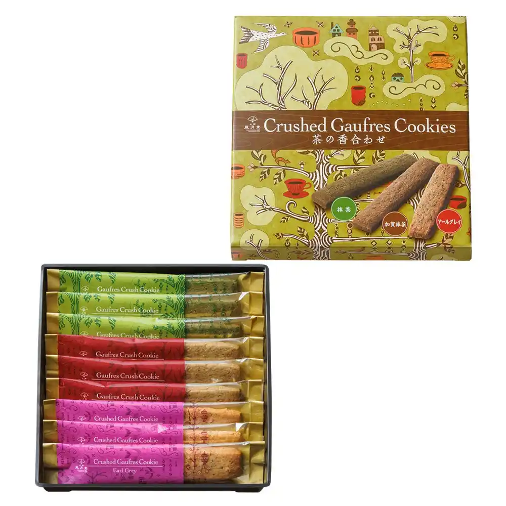 商品特長:「ゴーフルパウダー」をクッキー生地に練りこんだ、サクサクの食感が特徴の『ゴーフルクラッシュクッキー』から、香り高い3種類のお茶「抹茶」「加賀棒茶」「アールグレイ」の味をラインアップしました。 |