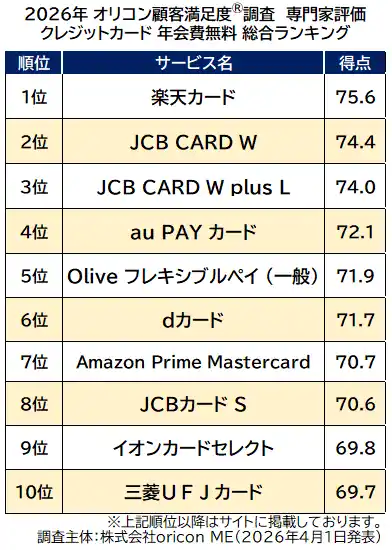 『クレジットカード 年会費無料(専門家評価)』総合ランキング(2026年 オリコン顧客満足度(R)調査) |