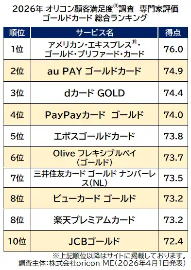 『ゴールドカード(専門家評価)』総合ランキング(2026年 オリコン顧客満足度(R)調査) |