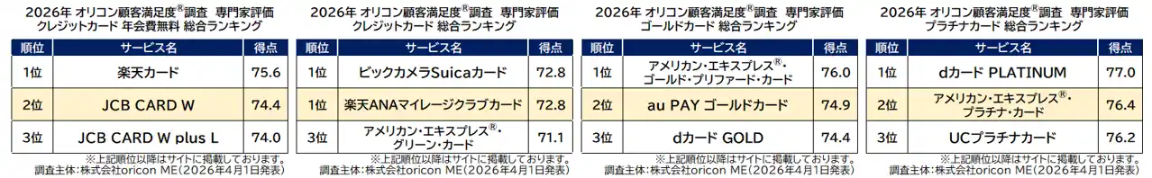 『クレジットカード(専門家評価)』各総合ランキングの結果(2026年 オリコン顧客満足度(R)調査) |