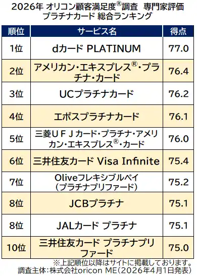 『プラチナカード(専門家評価)』総合ランキング(2026年 オリコン顧客満足度(R)調査) |