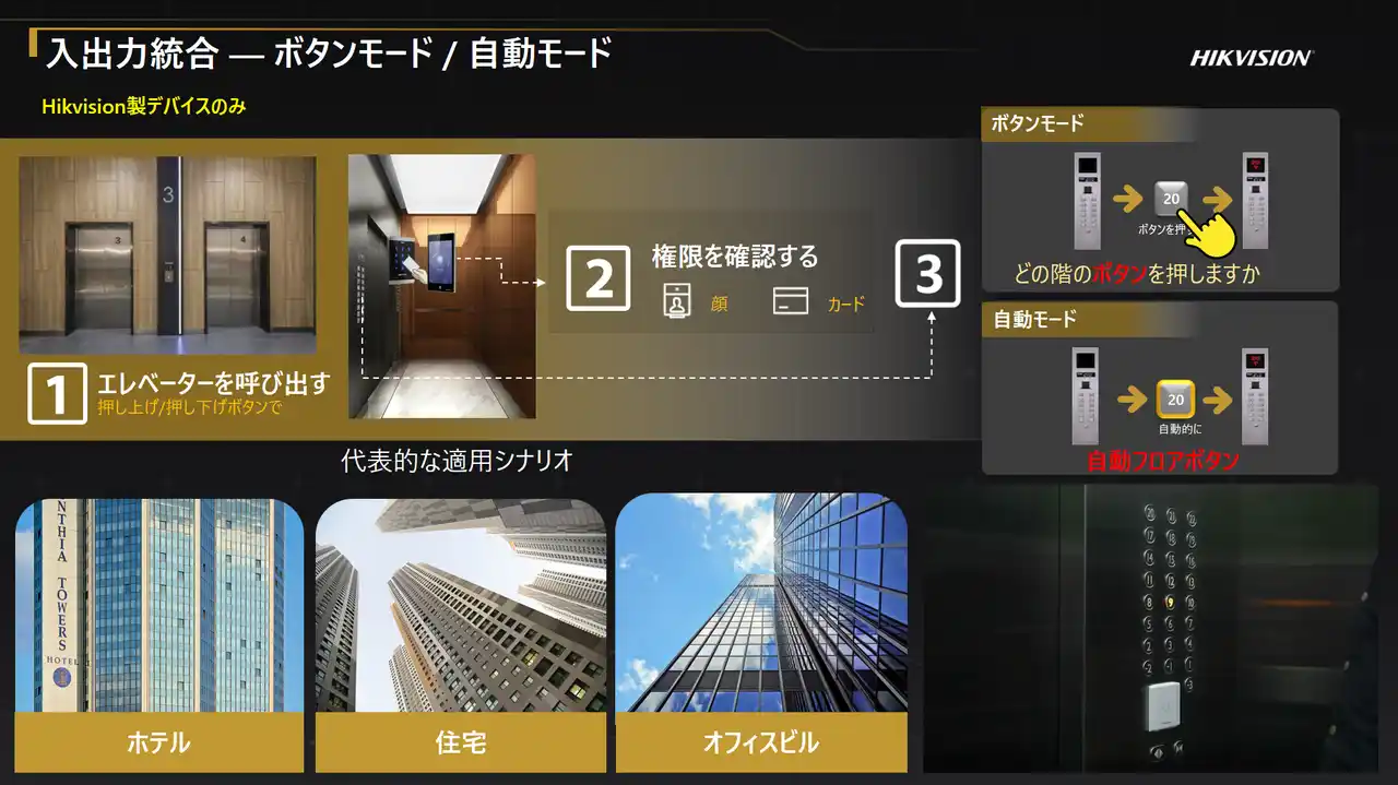 効率的な運用: ボタンモードと自動モードを柔軟に選択可能です。最大128階まで制御でき、エレベーターの配車機能により待ち時間を短縮。大規模ビルでもスムーズな人流管理をサポートします。 |